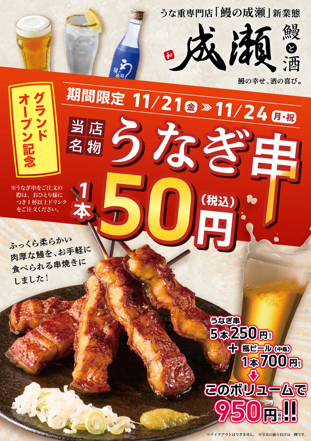 うなぎ好きの皆さん、耳寄りな情報です! 鰻専門店『鰻の成瀬』の姉妹ブランドである『鰻と酒 成瀬』が、11月21日から24日までの4日間、特別なキャンペーンを実施します。注目すべきはこの期間中、名物の「うなぎ串」がなんと1本50円で楽しめるという点です。