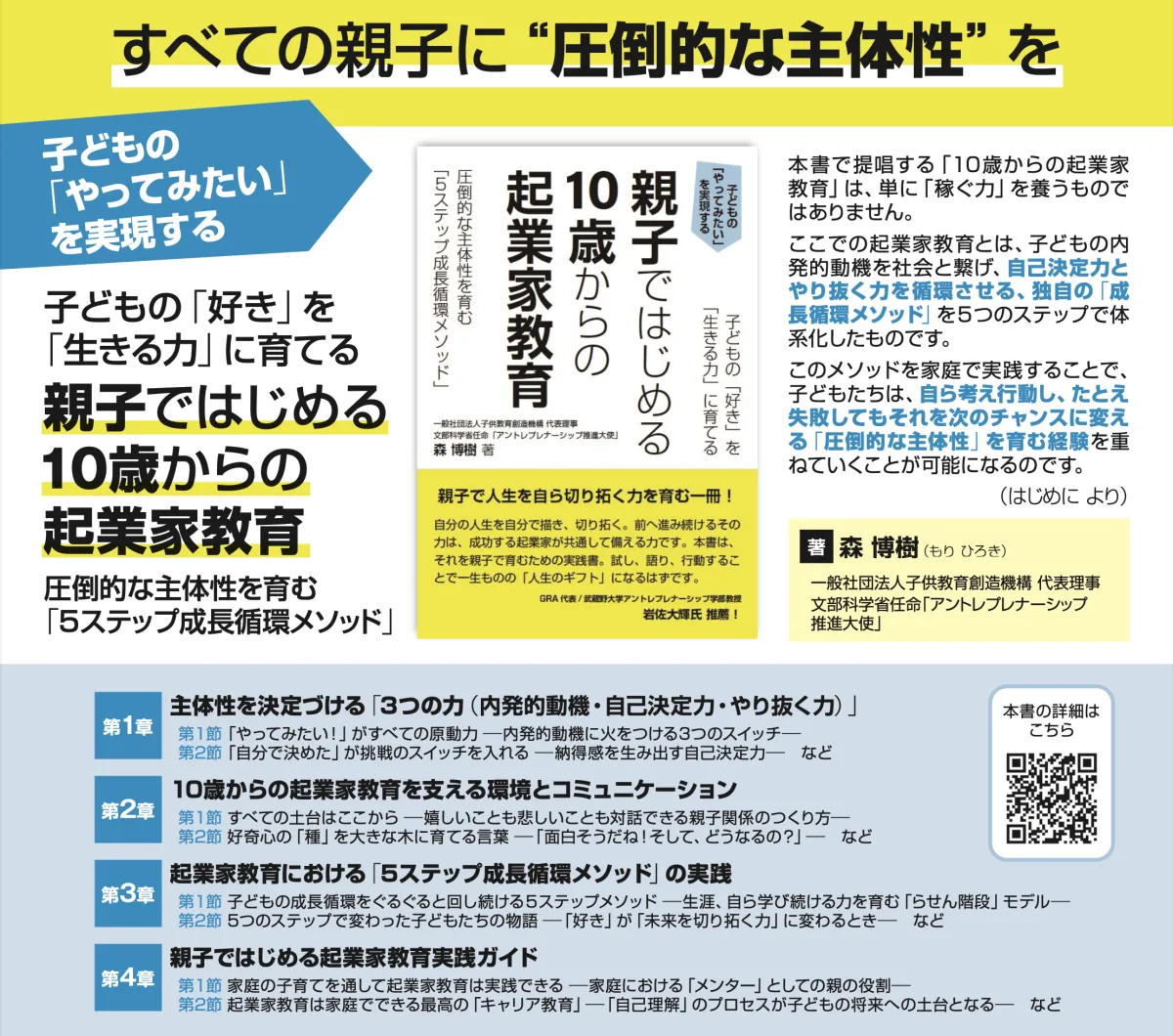 2025年12月、文部科学省任命のアントレプレナーシップ推進大使、森博樹氏による新刊『親子ではじめる10歳からの起業家教育』が学事出版より発売されます。この本は、家庭で実践できる起業家教育を提案し、子どもたちに必要な「主体性」を育む方法を体系化したものです。