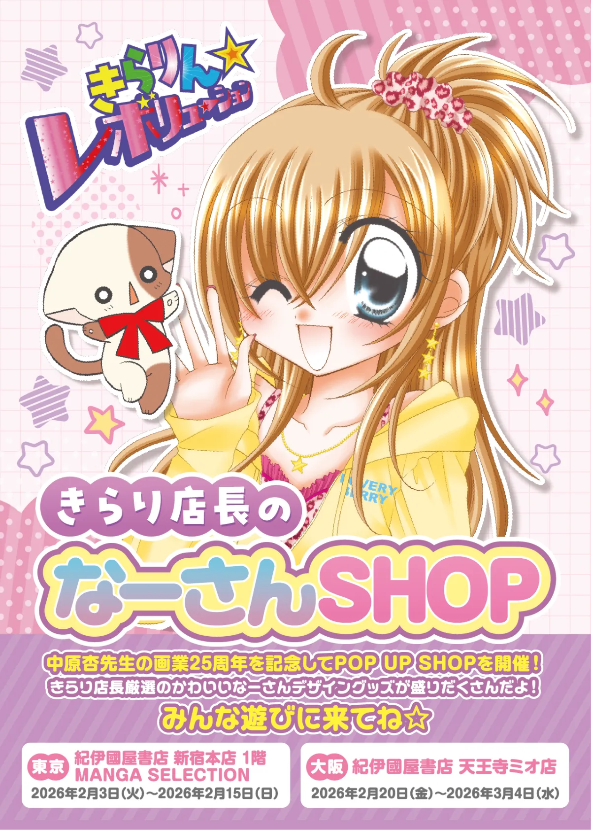 中原杏先生の画業25周年を迎え、待望のポップアップショップ『きらり店長のなーさんSHOP』が2026年2月3日から東京と大阪で順次開催されます。当ショップでは、『きらりん☆レボリューション』の魅力を詰め込んだオリジナルグッズが勢ぞろい。ファン必見のイベントとなっています。