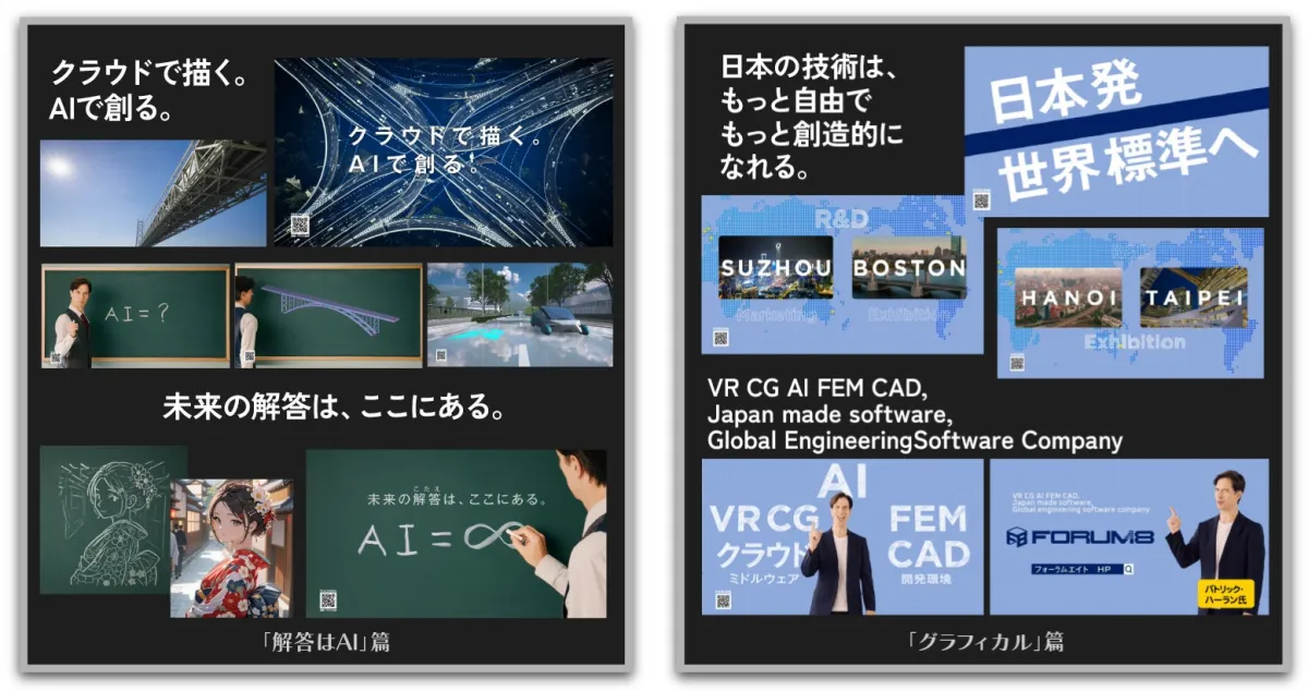 このCMはシリーズ第7弾となり、テーマは「Japan made software Global engineering software company FORUM8」。第一篇は「解答はAI」篇で、フォーラムエイトが開発したAIとクラウド技術がどのように未来を変えるのかを紹介。第二篇「グラフィカル」では、VR、CG、AI、FEM、CADといった先端技術を駆使して、実現可能な未来を描き出します。