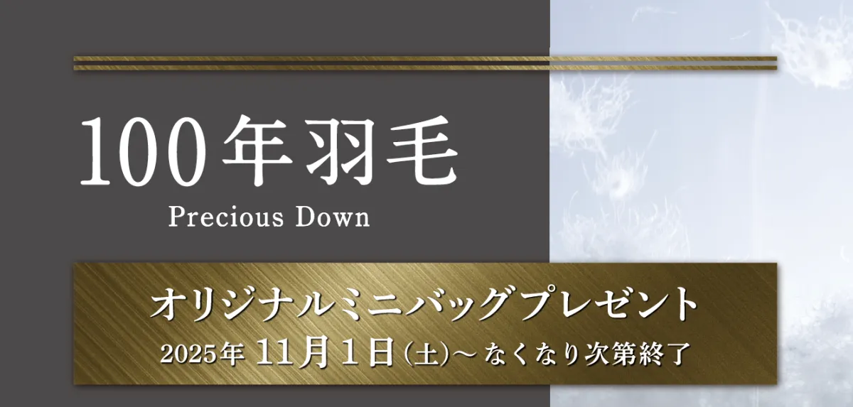 キャンペーンの実施期間は、2025年11月1日(土)から始まり、数量がなくなり次第終了となります。対象となるのは、100年羽毛シリーズを税込44,000円以上購入された方々です(一部の肌掛け含む)。