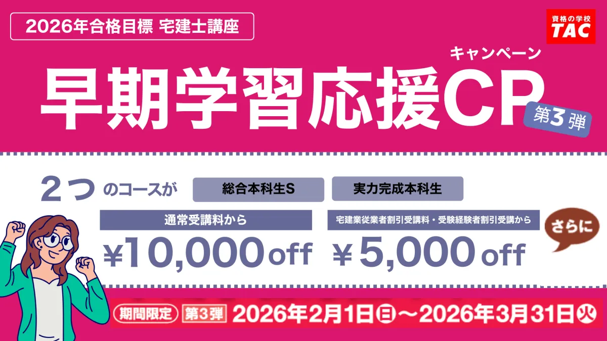 TAC株式会社が提供する宅建士講座では、2026年の宅建試験合格を目指す受験生に向けて「早期学習応援キャンペーン」を実施します。このキャンペーンは、2026年2月1日から3月31日までの期間中、すべての方が対象となります。特に、宅建試験の受験を考えている方には大変お得な内容が揃っています。