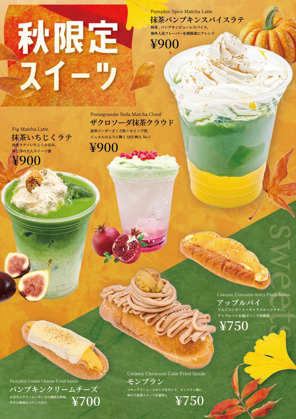 「FALL Harvest Party」の新作ドリンクは、全3種類がラインアップ。抹茶を基盤としながらも、秋の豊かな食材を巧みに融合させています。