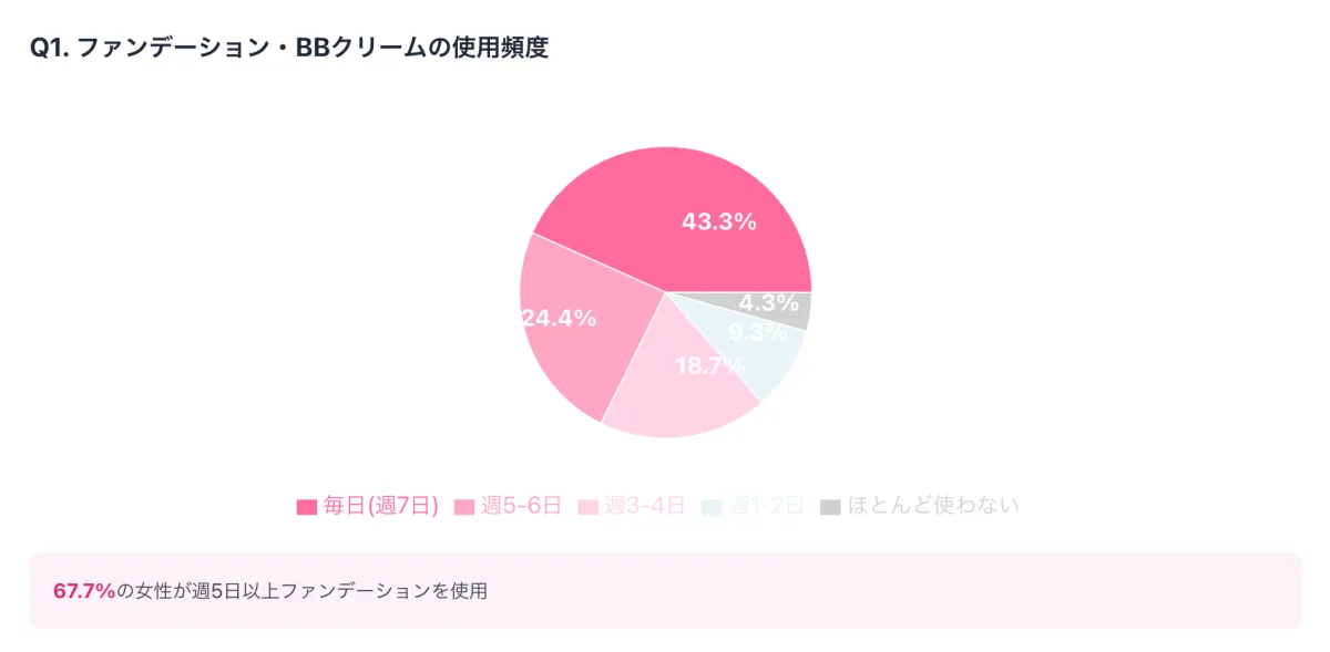 調査の結果、67.7%の女性が毎週5日以上ファンデーションやBBクリームを使用していることが判明しました。実に43.3%の女性は、週7日間、毎日メイクをしていることが分かっています。この背景には、秋から冬にかけての乾燥や気温の変化により、肌のくすみや血色の悪さが際立つため、多くの人がメイクで対処しようとしていることがあるのでしょう。