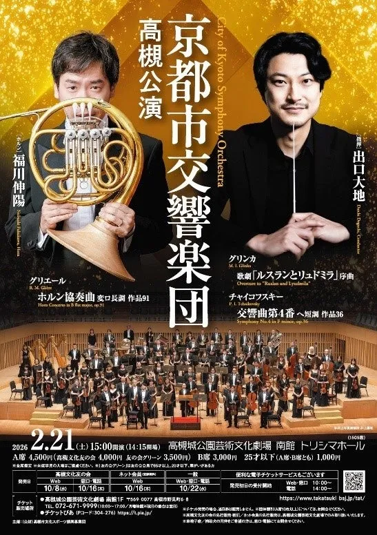 令和8年2月21日(土曜日)、高槻市の高槻城公園芸術文化劇場にて、京都市交響楽団の特別公演が開催されます。このイベントでは、世界的に有名な指揮者出口大地氏とホルン奏者福川伸陽氏が参加し、クラシック音楽の珠玉の名曲を披露します。