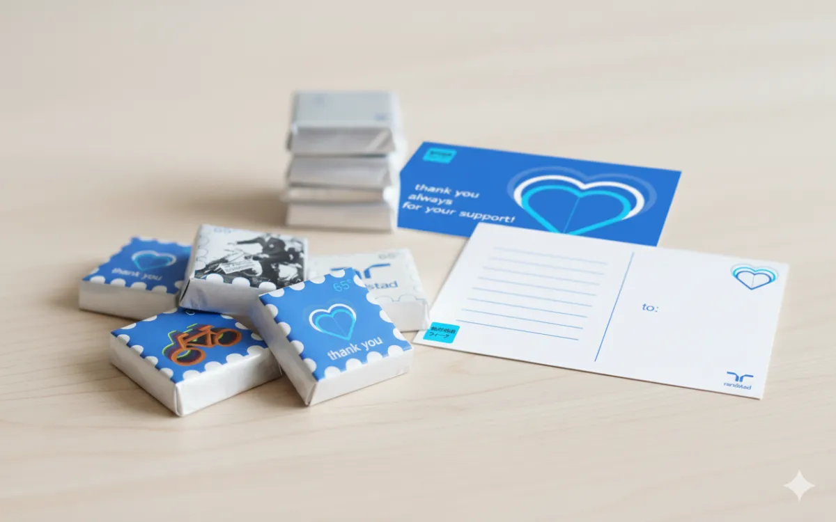 2025年の取り組みでは、全国約50か所のランスタッド拠点において、メッセージカードと切手型チョコをセットで提供します。社員たちは自由に同僚や家族に感謝のメッセージを贈ることができ、特にオンラインでのメッセージ交換も容易になります。物理的な距離が生じる在宅勤務の社員や、会えない相手に向けたメッセージもイントラネットの特設ページから送信可能で、感謝の気持ちを広める機会となります。