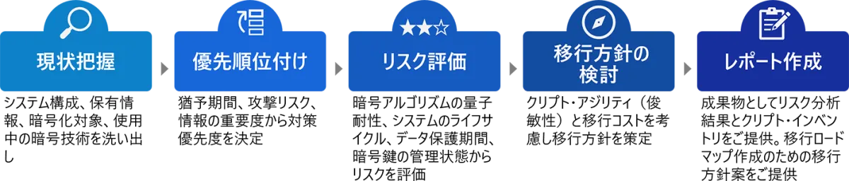 日立ソリューションズの「耐量子計算機暗号への移行に向けた支援サービス」では、セキュリティ専門のエンジニアチームが企業のITシステムで使用している暗号技術を洗い出し、リスク評価を行います。以下の5つのステップでサポートを提供します。