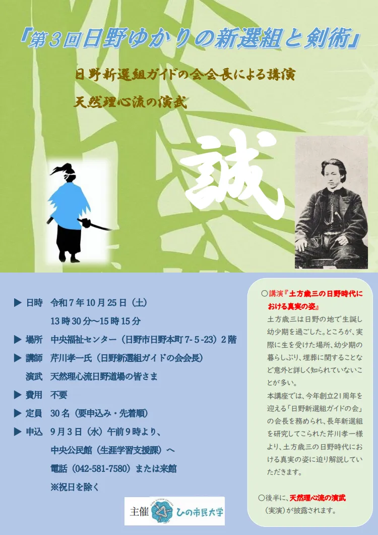 2023年10月25日、日野市中央福祉センターにて、地域の歴史と武道に深く触れる講座「第3回日野ゆかりの新選組と剣術」が開催されます。この講座では、日野市に縁のある新選組の重要な人物、土方歳三の実態を掘り下げるとともに、天然理心流の剣術演武も体験できる特別な機会です。