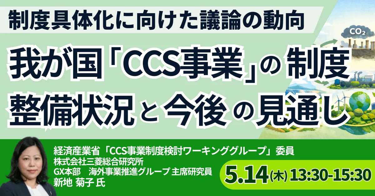 2026年5月14日(木)の午後、我が国における「CCS事業」の制度整備状況と今後の見通しに関するセミナーが開催されます。本セミナーは、経済産業省の「CCS事業制度検討ワーキンググループ」の委員である新地菊子氏を講師に招き、重要なトピックについて掘り下げる貴重な機会となります。