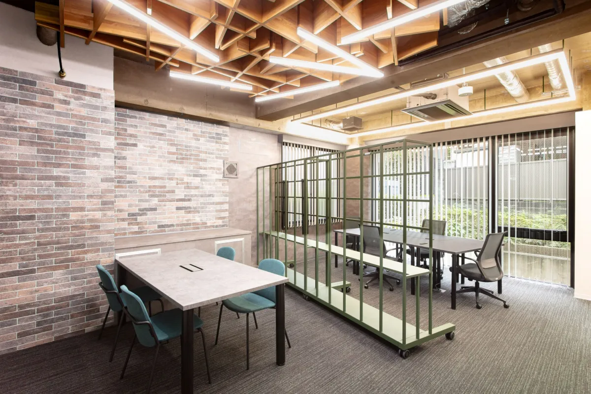 打合せエリアは『デザイン性優先エリア』として位置づけ、木の天井造作と壁面レンガタイルを使用しています。また、トレンドを意識したアートを配置し、クリエイティブな環境を醸成しています。