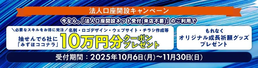法人口座開設月の翌々月末時点で、口座残高が10万円以上の企業の中から抽選で6社に、会社のロゴ制作やウェブサイト作成に利用できる「みずほココナラクーポン10万円分」をプレゼントします。