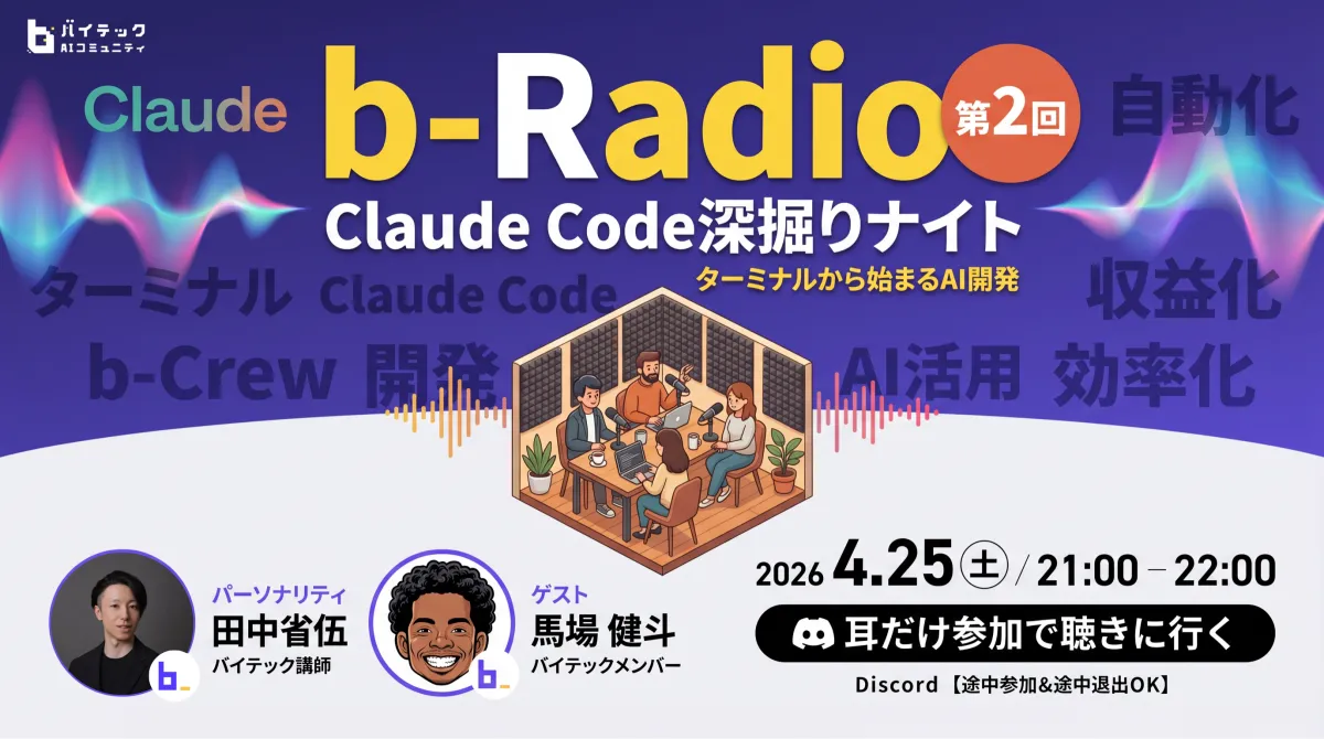 バイテック生成AIオンラインスクールが運営する実践型AIコミュニティ「b-Crew」が、Discordボイスチャットを利用したリスナー参加型ラジオ「b-Radio」の第2回を開催します。日程は、2026年4月25日(土)21時から22時までの予定です。今回は「Claude Code深掘りナイト ― ターミナルから始まるAI開発」をテーマに、実務でのAI活用方法に迫ります。
