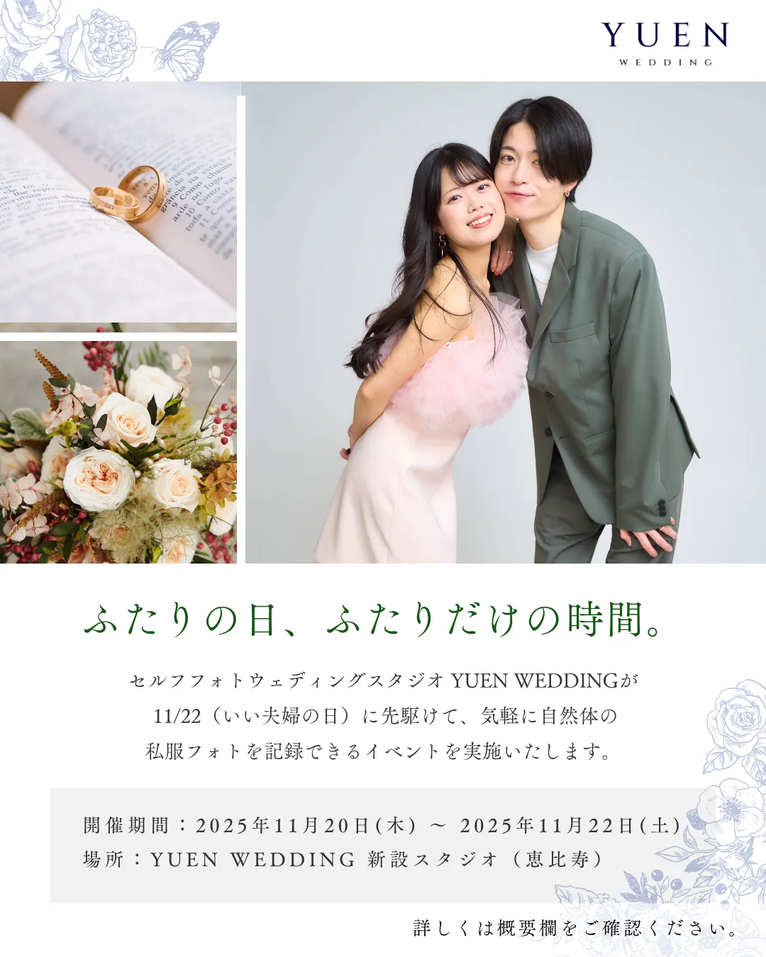 2025年11月20日から22日まで、恵比寿のセルフフォトウェディングスタジオ「YUEN WEDDING」にて、記念日である「いい夫婦の日」を祝う特別な無料フォトイベントが開催されます。このイベントは、あらゆるカップルや夫婦が対象で、参加者は15分の間、プロの機材を使って自由に写真を撮影できます。自然体の二人を残すこの機会をお見逃しなく!