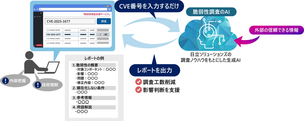 新サービスでは、グローバルに公開される共通脆弱性識別子(CVE)をもとに、生成AIが脆弱性の概要や影響を受けない条件を明確に解説します。具体的には、「外部からアクセスされない」、「特定の機能を実装していない」といった条件を提示することで、企業が優先的に調査が必要な脆弱性を迅速に選別できるようになります。
