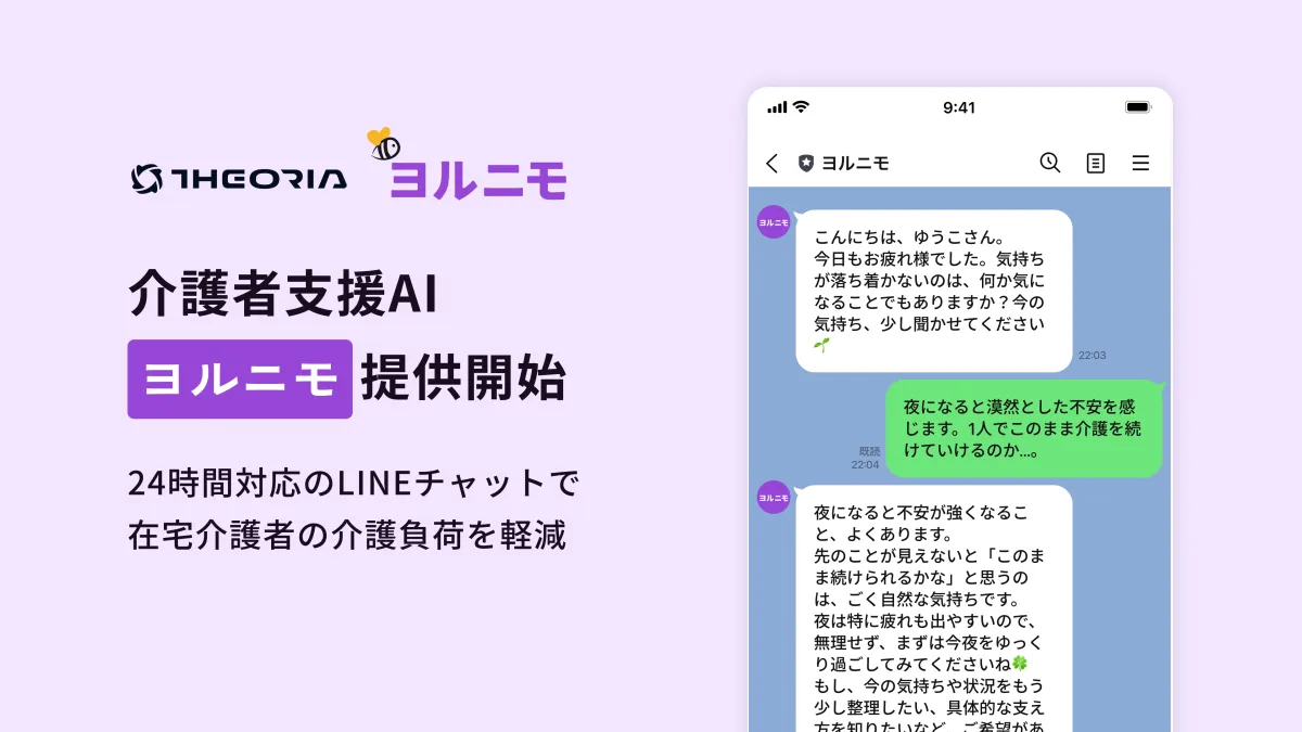 近年、日本が超高齢社会に直面する中で、在宅介護を行う家族や親族の負担は増す一方です。特に、認知症を抱える方の介護においては、判断に迷いが生じたり、孤独感を抱くことが多く、介護者の心理的な負担は大きくなっています。こうした中、テオリア・テクノロジーズ株式会社は、介護者が抱える悩みや孤独を解消するための新たな選択肢として、介護者支援AI「ヨルニモ」のLINE版を提供することを発表しました。