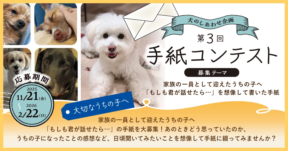 愛犬との絆をさらに深めるための絶好の機会がやってきました。「第3回 手紙コンテスト」が、2025年11月21日(金)から2026年2月22日(日)までの期間で開催されます。このコンテストは、犬を家族として迎え入れた皆さんが愛犬への想いを綴るためのものです。テーマは「もしも君が話せたら…」。このテーマに基づいて、愛犬に対する思いを手紙という形で表現してみましょう。