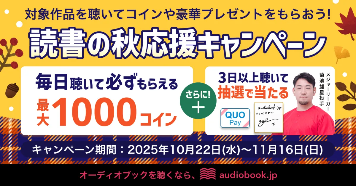 この秋は、オーディオブックを通じて新たな読書体験を楽しみませんか?「読書の秋応援キャンペーン2025」は、新しい本との出会いを通じて、みなさんに充実した時間を提供します。そして、豪華プレゼントも手に入るチャンスですので、ぜひ特設サイトやアプリを訪れてみてください!