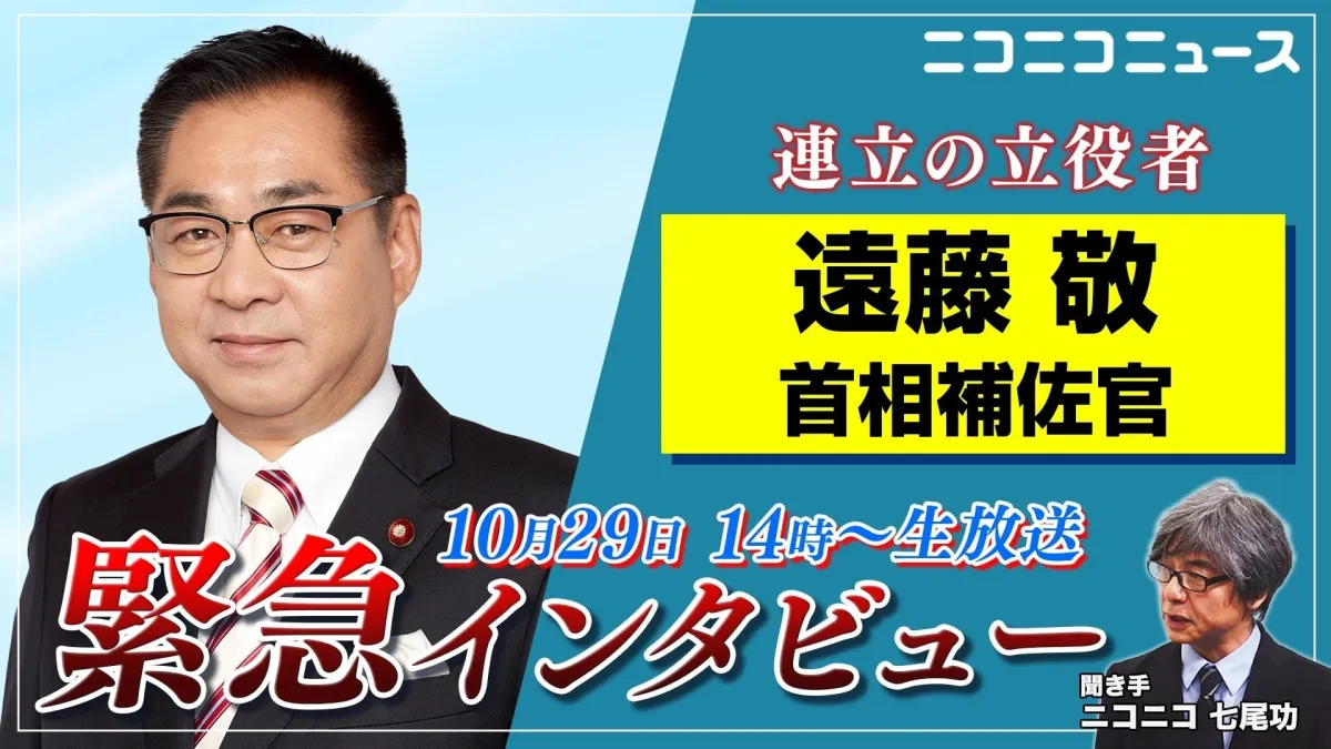 日本の政治シーンが風雲急を告げる中、自民党と維新の会の連立協議が注目を集めています。この連立の実現に深く関与しているのが、遠藤敬内閣総理大臣補佐官です。彼は、2025年に発足した高市早苗内閣のもとで、連立合意政策を推進する重要な役割を担っています。この度、彼の初のネットメディア出演となる独占インタビューが決定しました。インタビューは、10月29日(水)14時から50分間、ニコニコ生放送やYouTube、公式Xで生配信されます。