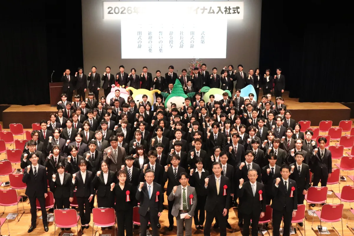 式典では新入社員が誓いの言葉を述べ、先輩社員からも心温まる歓迎の言葉を受け取りました。式の最後には記念撮影が行われ、新たなスタートを切った新入社員たちの晴れやかな表情が印象的でした。