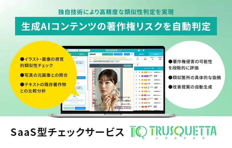 生成AIが普及することで、コンテンツ制作は容易になりましたが、既存の著作物との類似性や権利侵害のリスクも増大しています。特に商用コンテンツでは、法的リスクが大きくなるため、多くの企業やクリエイターがその対策に苦慮しています。トラスクエタは、こうした課題に応えるべく、著作権に関するリスクを事前に評価できる機能を実装しました。