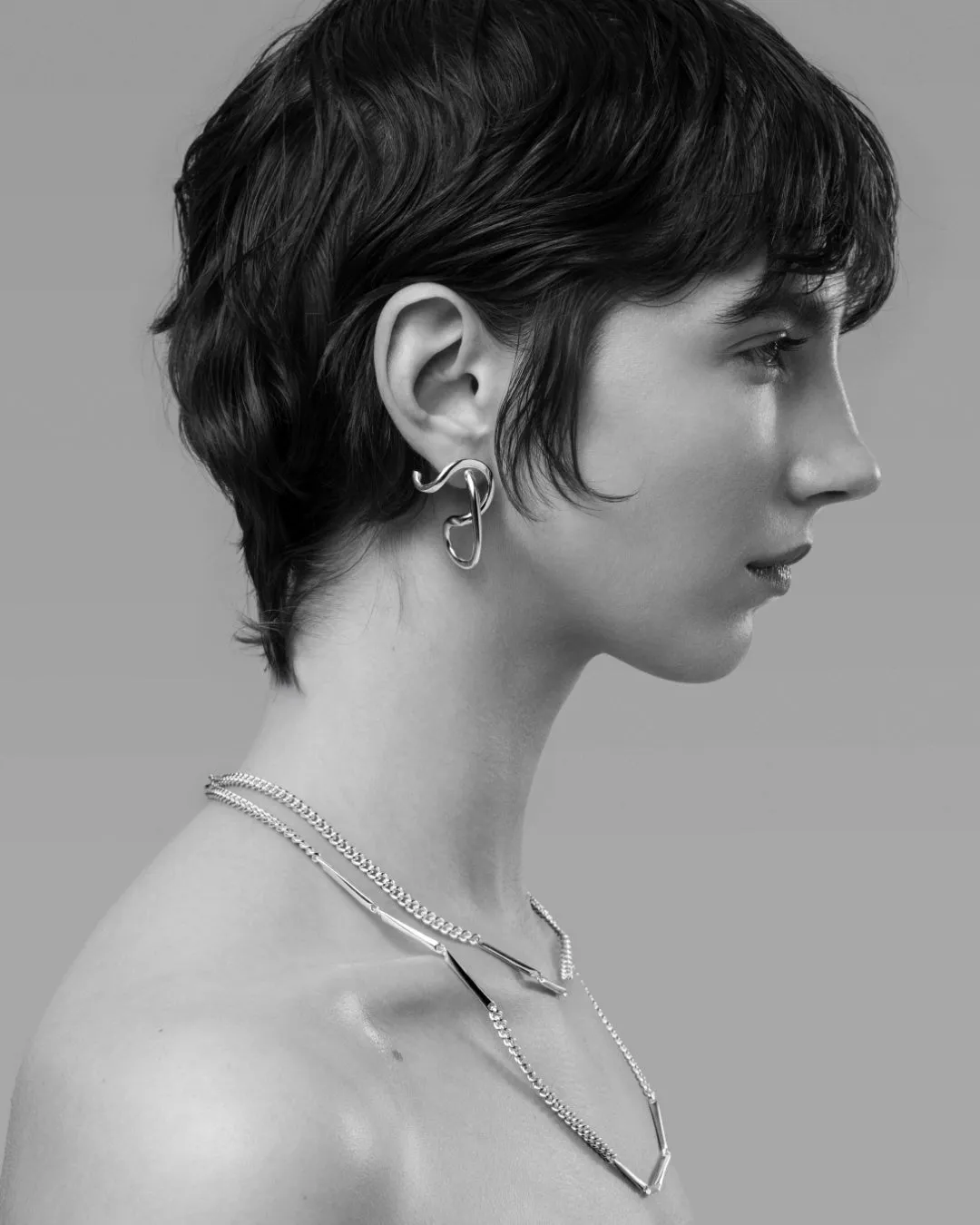 無機質なシルバーに流れるような動きとモダンなデザインが融合しており、特にオキシダイズド仕上げが施された部分は、着用者の動きに応じた光の反射で多彩な表情を見せます。このコレクションは、シルバーならではの重厚感を楽しむことができます。