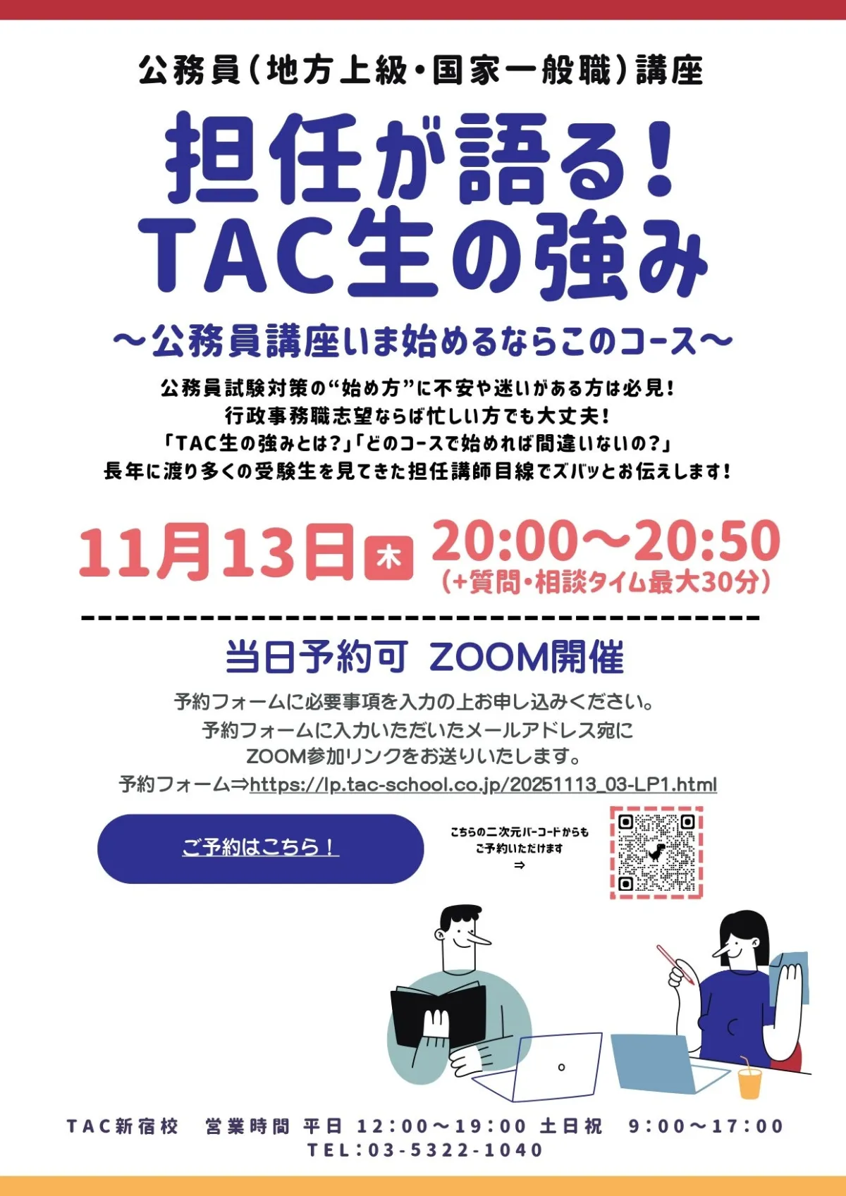 2025年11月13日(木)、TAC公務員講座は公務員試験を考えている方々向けのオンラインウェビナーを開催します。このウェビナーでは、特に行政事務職を志望する方々に向けて設計されています。時間は夜の20:00から20:40まで、さらに最大60分間の質問・相談タイムも設けられています。