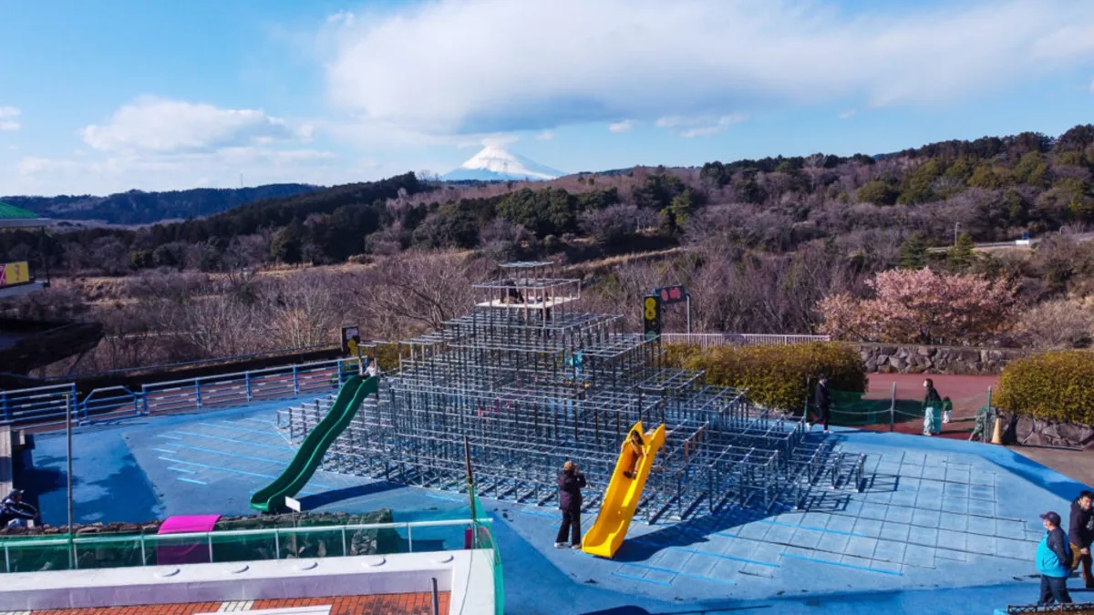 伊豆の「自転車の国サイクルスポーツセンター」にあるこのステンレス製ジャングルジムでは、洞窟のような探検ルートや滑り台など、さまざまな楽しみが詰まっています。登る喜びを感じるだけでなく、まるで冒険家になった気分で楽しむことができます。晴れた日には頂上から富士山の美しい景色も楽しむことができる特別な体験です。安全対策も万全で、クッションマットが敷かれた床で安心して思い切り遊ぶことができます。