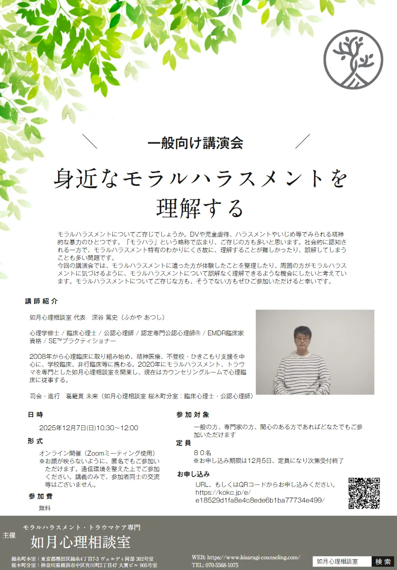 東京都墨田区にある如月心理相談室は、2025年12月7日(日)に、一般向けの講演会「身近なモラルハラスメントを理解する」を開催します。参加は無料で、オンラインでの参加が可能です。