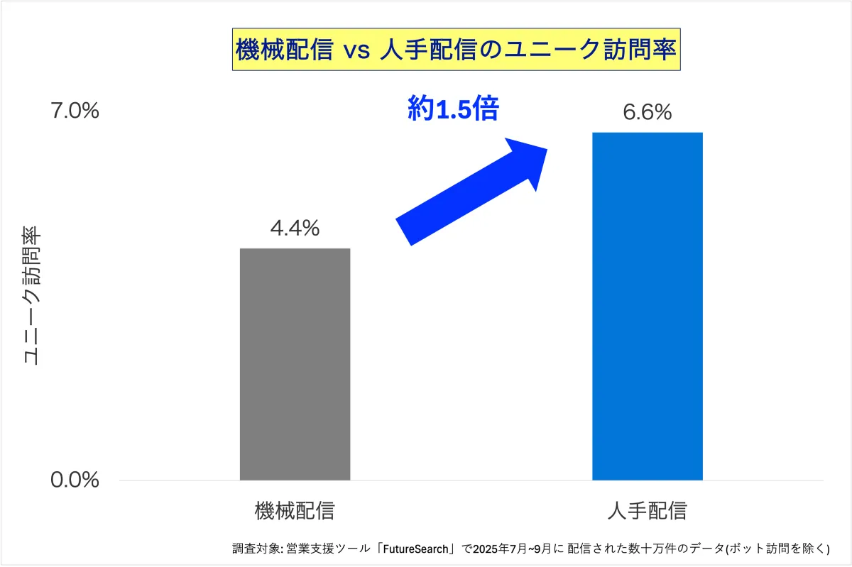 営業フォーム営業には、自動配信と人手配信の2つの方法があります。「FutureSearch」では両方のハイブリッド型配信を行っており、結果として人手配信によるユニーク訪問率は機械配信の約1.5倍という結果が得られました。これは、柔軟な対応が可能な人手配信が、他の企業との差別化を図ることにつながるからです。