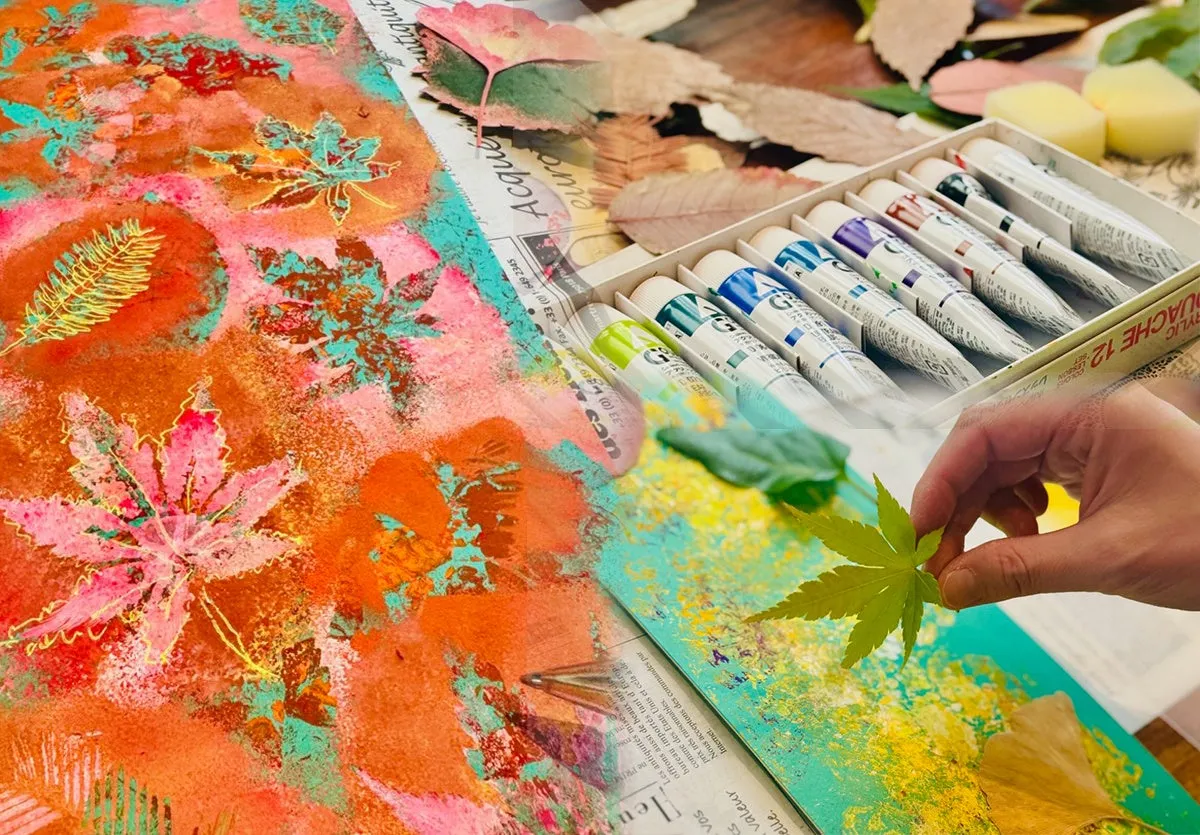 敬愛する自然の美しさをヒントにした「落ち葉のコンポジション」では、紅葉の美しい色合いや葉の独特な形を感じながら、作品を楽しむことができます。落ち葉が生み出す多様な模様や色をステンシル技法を用いることで、自身の感性を存分に表現することが可能です。この秋に、普段とは違った視点からアートを味わってみるのも良いでしょう。