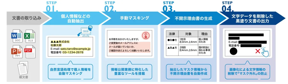「情報公開支援システム」は、機密情報を自動で抽出し、必要な部分を適切に黒塗りすることで、一件あたりの作業工数を約50%削減することが見込まれています。具体的には、情報開示請求において、公文書の中から個人情報や法人に関する情報をシステムが自動で特定し、ハイライト表示する機能があります。これにより、職員は必要な情報を迅速に確認できます。システム上に登録した単語をもとに、該当箇所を自動でハイライトすることも可能です。