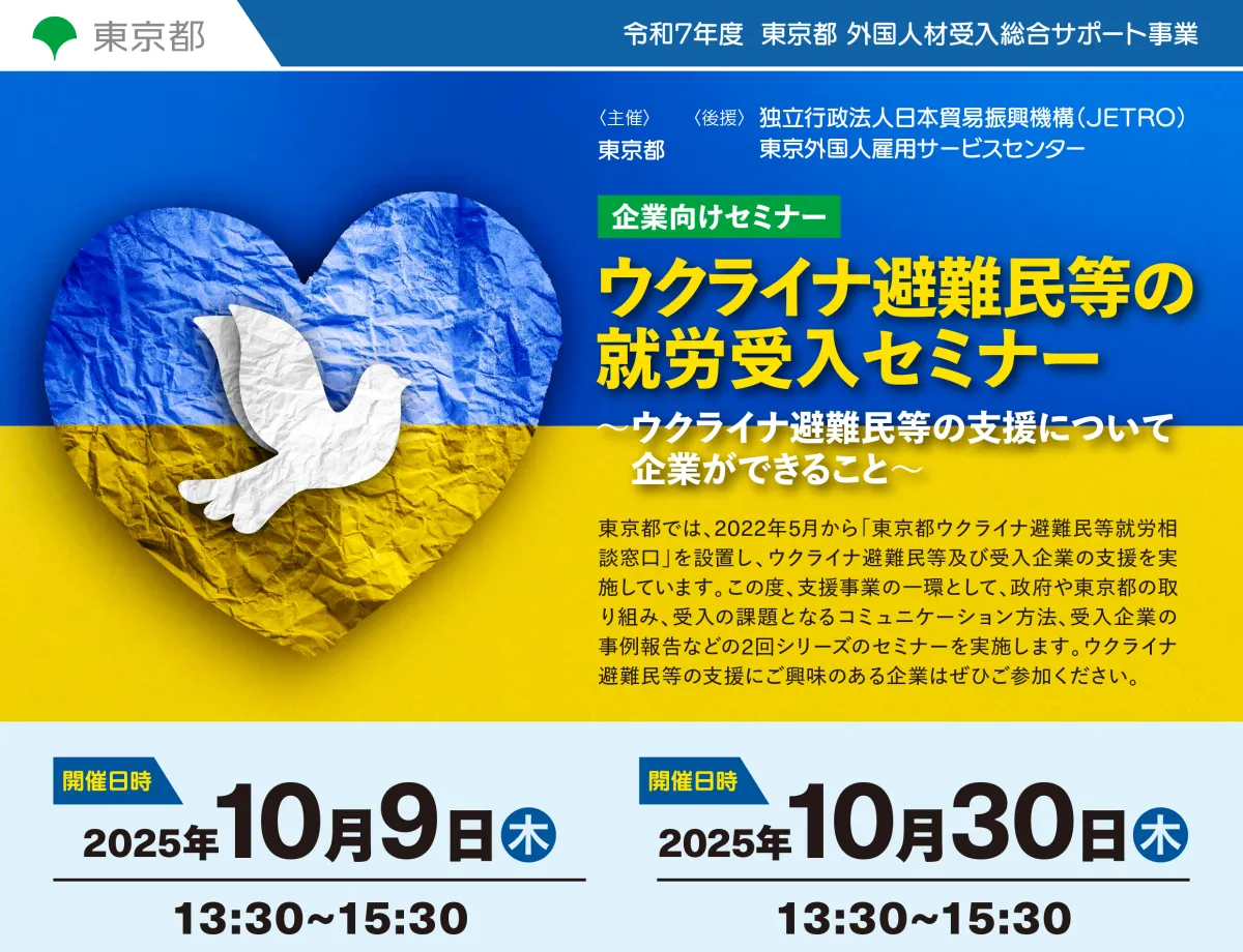 東京都は、ウクライナ避難民を受け入れる企業を支援するために、2025年10月9日(木)と10月30日(木)に「ウクライナ避難民等の就労受入セミナー」を開催します。このセミナーは、外国人材採用に意欲的な企業様を対象にした対面とオンラインのハイブリッド形式での実施です。
