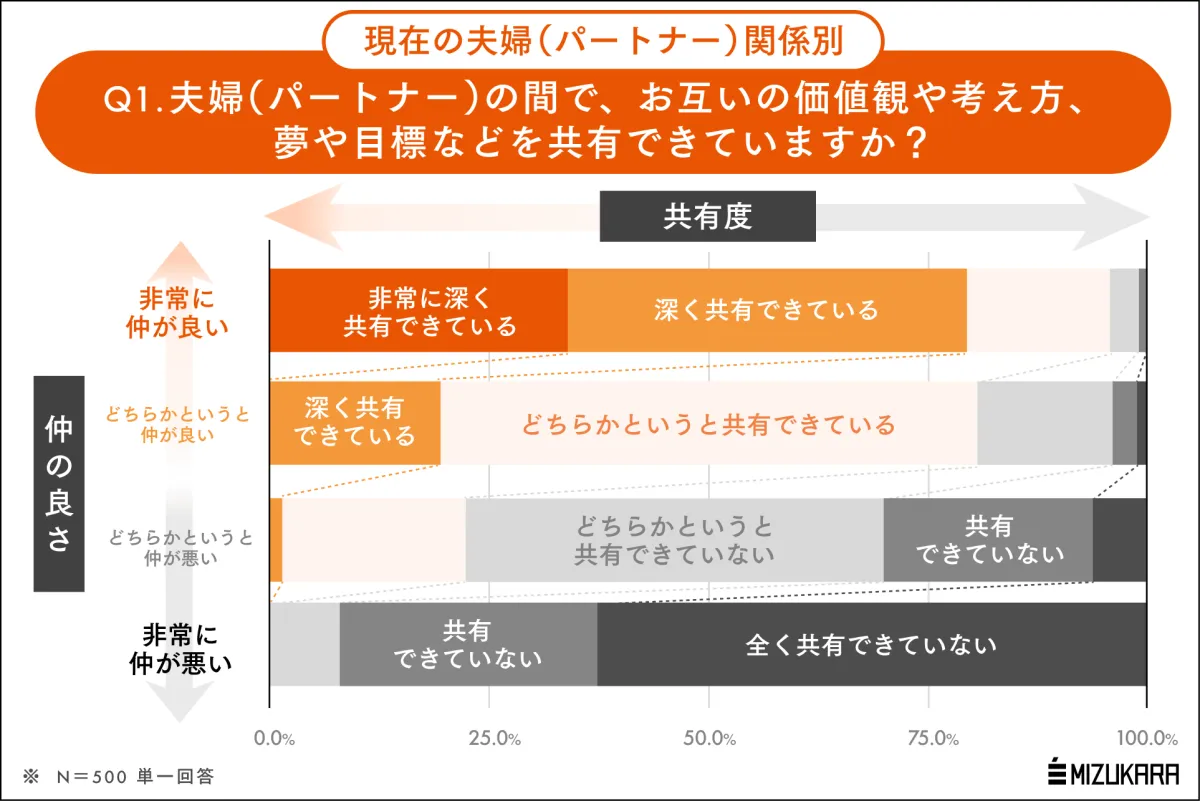 今回の調査では、25歳から59歳の既婚有職男女500名を対象に、「いい夫婦」の条件について分析されました。その結果、夫婦間で夢や価値観を共有することが、仲の良い夫婦の秘訣というこの調査は非常に興味深いものでした。実際、仲が良い夫婦ほどお互いの価値観を理解し合い、共感している傾向が見られることがわかりました。