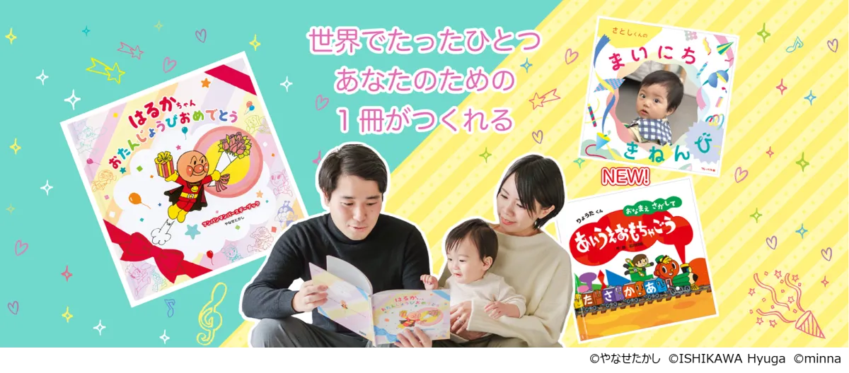 大切なお誕生日を盛り上げてくれる絵本で、アンパンマンやその仲間たちが登場し、お子さまのお祝いをします。お子さまの写真や成長記録を載せることができ、まさに世界に一冊だけの絵本になります。