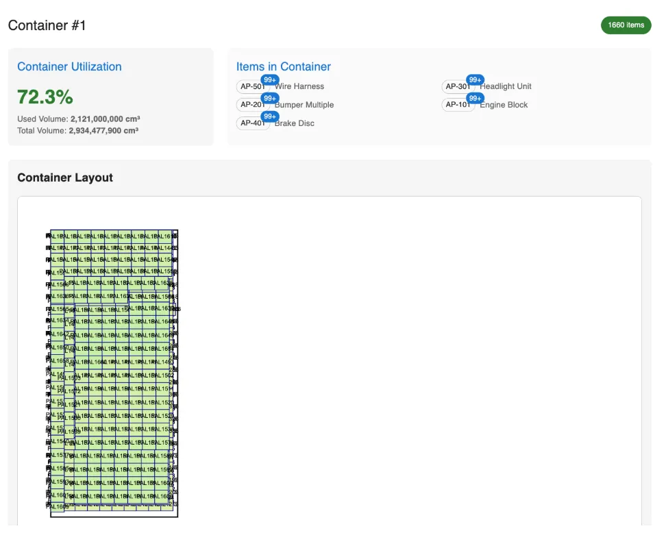 このソリューションにより、コンテナのサイズを選び、配送する貨物を入力することで、自動的に効率的な積載方法を導き出すことが可能になります。