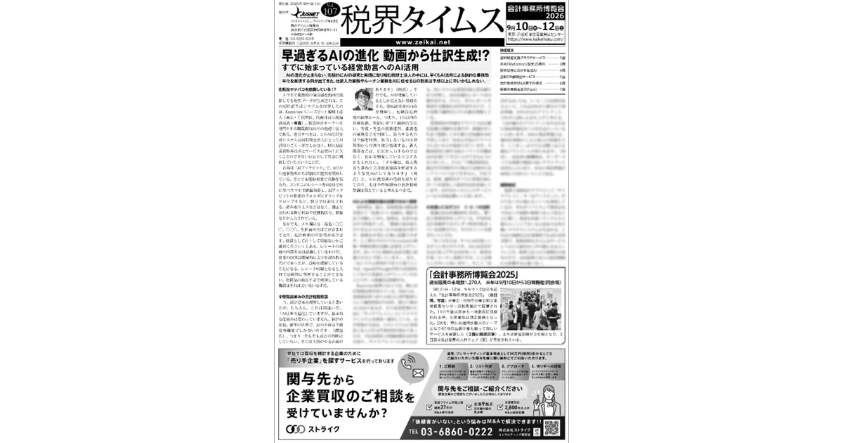 株式会社クリーク・アンド・リバー社の傘下にあるジャスネットコミュニケーションズが発行する税理士向け専門紙『税界タイムス107号』が、業界の最前線を駆け抜ける革新的な情報を届けています。この号では、特に注目すべきは、動画撮影を活用して仕訳を自動生成するAI-OCR技術の導入事例です。これにより、税理士業務の効率化や新入社員の教育に新たな光が当たります。
