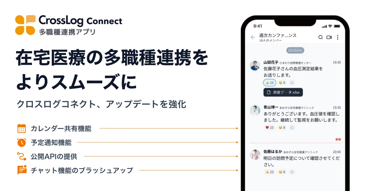 「CrossLog Connect」は、在宅医療に特化した多職種間の情報共有を支援するアプリです。患者情報と連携した機能により、業務効率の向上を実現することを目指しています。これにより、皆さまの大切な時間が少しでも軽減されることを願っています。