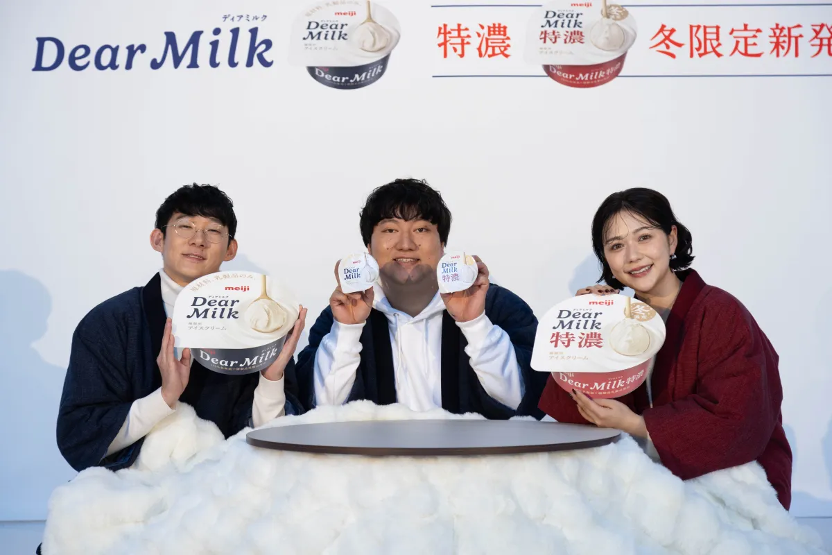 冬の季節がやってきました。寒い時期に楽しむこたつで、アイスクリームの「明治 Dear Milk」を味わう新たな体験が二子玉川ライズで開催されました。イベントは、2025年12月1日から4日までの期間限定で「何も足さない?カフェ」としてオープンし、人気お笑いコンビであるロングコートダディの堂前透さんと兎さん、またタレントの村重杏奈さんが登場しました。彼らは真っ白なこたつを囲み、ホットドリンクとのペアリングを楽しみ、その美味しさについて熱く語り合いました。