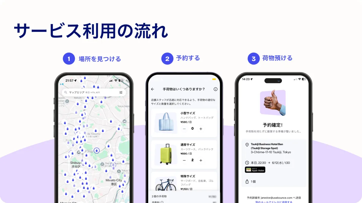 「Bounce」の利用方法はシンプルで、サービスサイトから簡単に予約ができ、携帯電話を使ってスムーズに荷物を預けられます。たった数秒で手続きが完了し、旅の計画がさらにスムーズに進むでしょう。