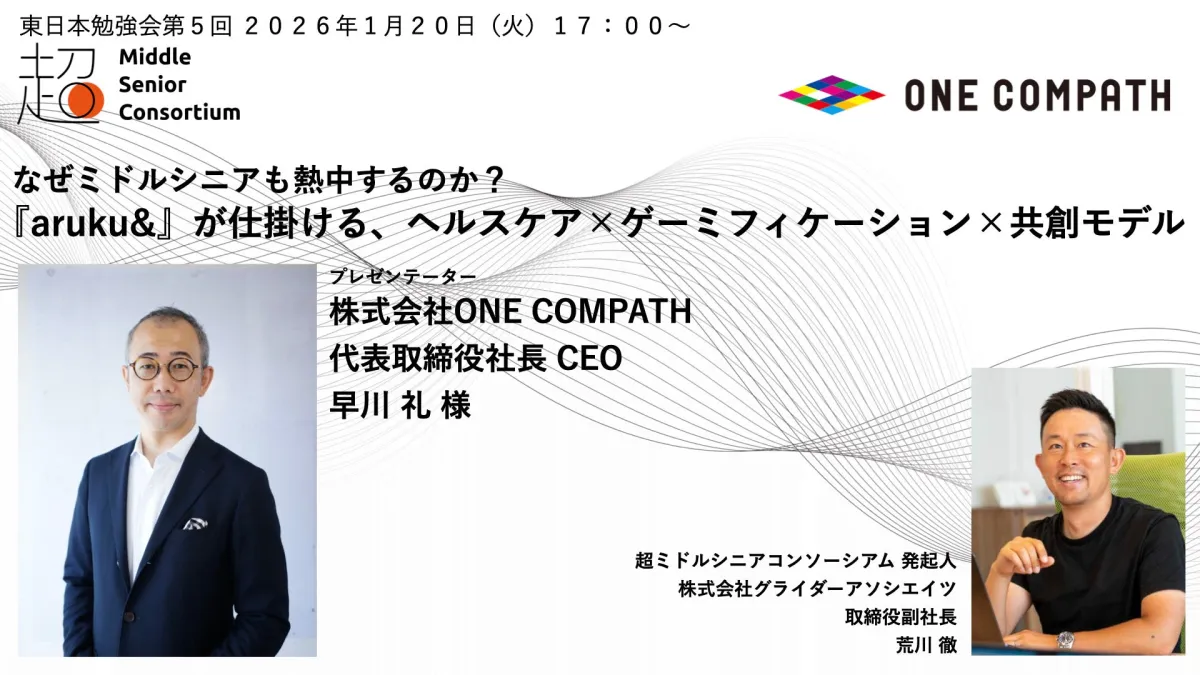 2025年に結成された「超ミドルシニアコンソーシアム」は、企業を越えた共同体として発展を遂げています。2026年1月20日(火)、このコンソーシアムの第5回勉強会が開催されます。今回のゲストは、株式会社ONE COMPATHの代表取締役CEO、早川礼氏です。早川氏は、ウォーキングアプリ「aruku&(あるくと)」の開発について、健康とゲーミフィケーションの交わりについてお話しします。
