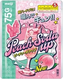 「ピーチソーダアップ」は、甘酸っぱいピーチフレーバーが特徴で、爽やかな食感が楽しめるグミです。パッケージデザインも“平成レトロ”を意識した可愛らしさが漂っており、手に取るのが楽しくなるようなデザインに仕上げられています。容量は75gで、適度なサイズ感が特長です。お手頃なサイズから、気軽に試しやすいのもポイントです。