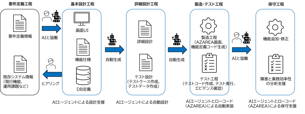 さらに、AZAREA Agent+はCACのローコード開発基盤「AZAREA Gene」と連携しており、設計からテスト工程までをシームレスに自動化します。AIが生成した設計情報を基に、自動生成されたコードやテストケースも活用し、総合的な開発工程の効率化を実現します。