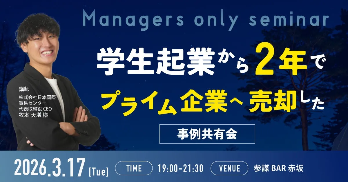 創業からわずか2年で、営業利益率が50%を超える事業を展開し、ついには東証プライム上場企業への事業売却を成功させた起業家、牧本天増氏。彼の圧倒的な成功体験を学ぶ勉強会が、2026年3月17日に東京・赤坂で開催されます。このイベントは、経営者の方々にとって必見の内容となっています。