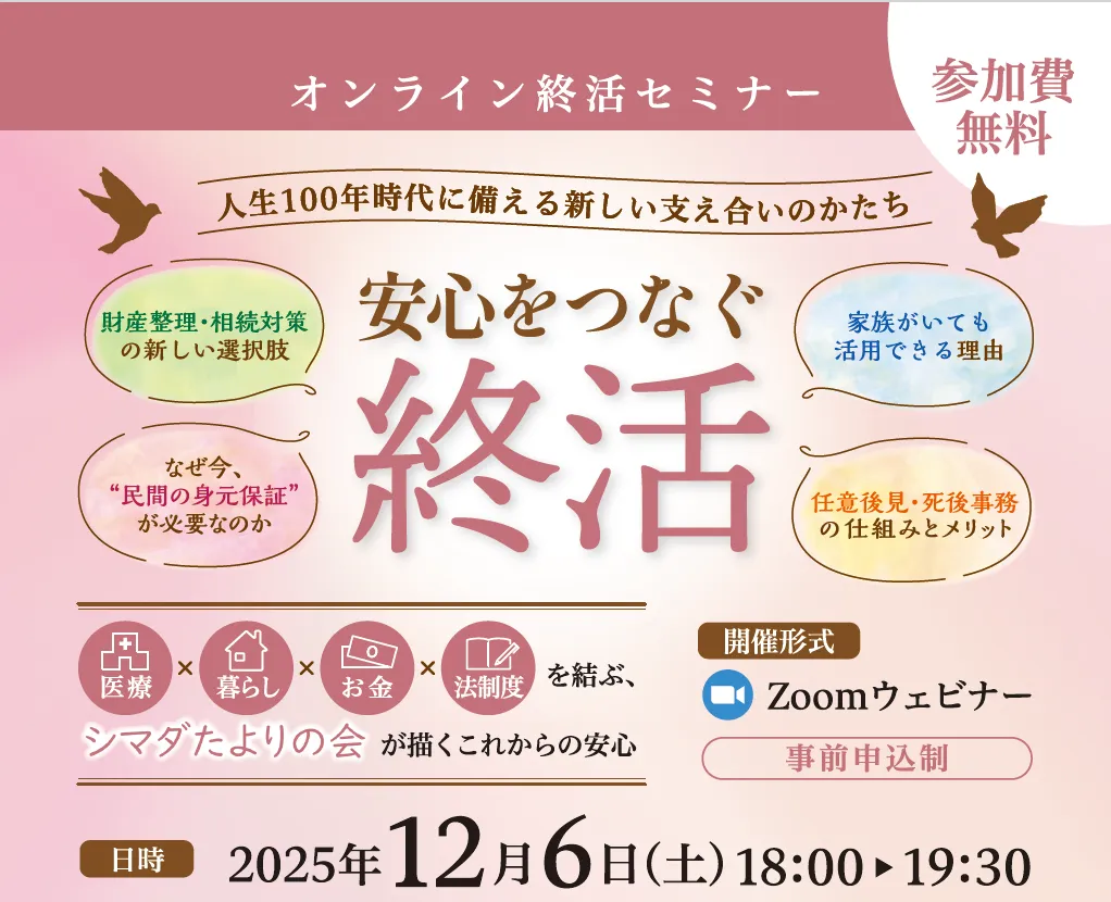 人生が100年に及ぶ現代、私たちは高齢者支援において新たなアプローチを求められています。この度、シマダグループの関連法人である「一般社団法人シマダたよりの会」が、人生100年時代に対応した新しい終活について解説する無料オンラインセミナーを開催します。