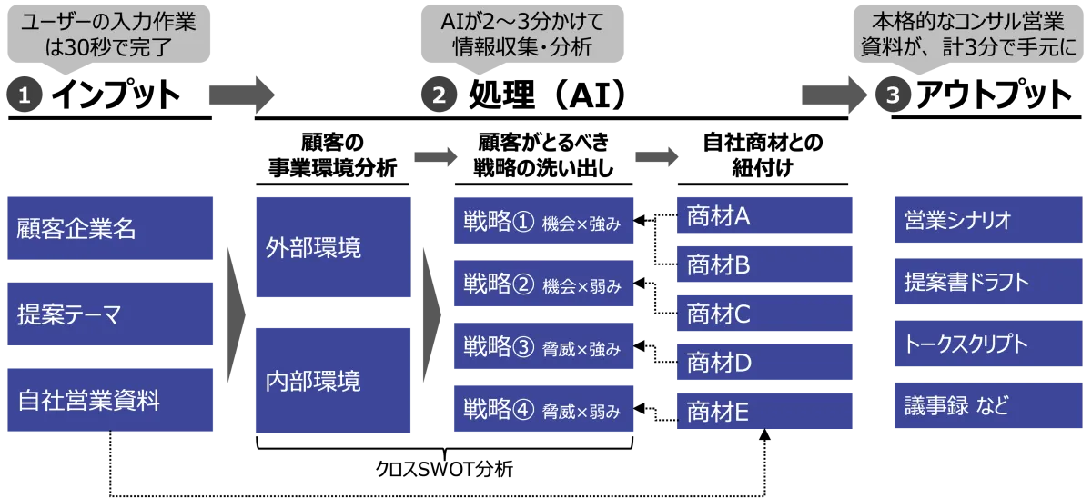 コンサルティング営業AIエージェントは、実践的なモデルである「クロスSWOT分析」を活用し、顧客の課題を整理できる点がこのサービスの特徴です。ユーザーが顧客名と提案テーマを入力するだけで、AIは瞬時に営業シナリオを生成します。