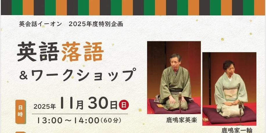 2025年11月30日、英会話イーオンが主催する参加型イベント「英語落語&ワークショップ」が大盛況で行われました。このイベントには、一般社団法人英語落語協会から鹿鳴家英楽さんと鹿鳴家一輪さんがお招きされ、45名の参加者が集まりました。