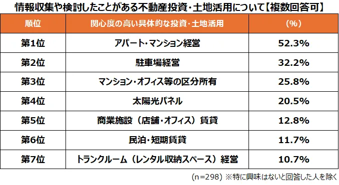調査結果からも明らかになるように、多くの人々が土地や物件の活用法の選択肢の中でトランクルームに注目しています。最も関心を集めたのは「アパート・マンション経営」で、52.3%の回答者がこの方策に理解を示しました。これに続くのが「駐車場経営」や「区分所有」といったルートです。特に、駐車場経営は都心部で需要が増加していることから、運用のしやすさが際立っています。さらに、「民泊」や「トランクルーム経営」も同様の関心を集め、新たな土地活用としての位置づけがなされつつあります。これらのトレンドからは、安定収益を求めながらも、新しい土地活用法に対する探求心が芽生えていることが浮かび上がります。