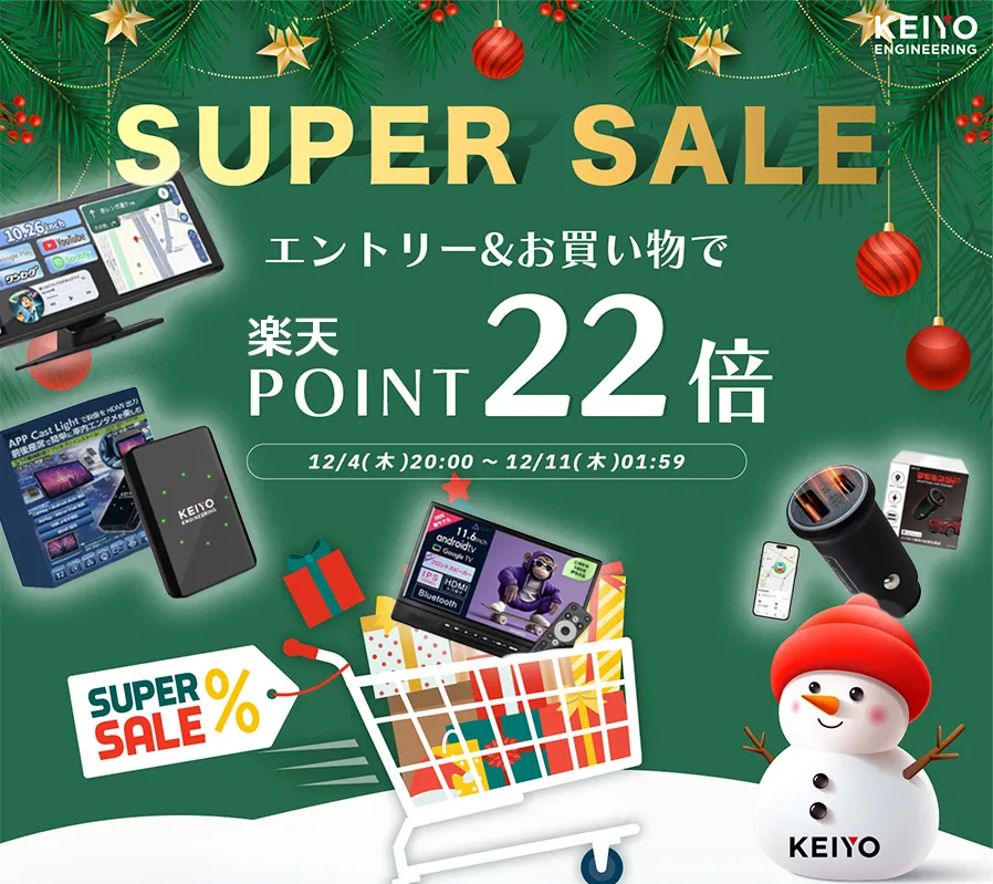 楽天スーパーセールは12月4日(木)の20:00から始まり、12月11日(木)01:59まで開催されます。この期間中にKEIYOのカーエンタメ商品を購入することで、年末年始の車移動を楽しくしてくれるアイテムが手に入ります。特に、30,000円以上の購入で使える3,000円クーポンや、10,000円以上のお買い上げで使える500円クーポン、さらには限定のスタートダッシュクーポンも用意されています。