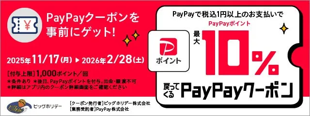 キャンペーン期間は2025年11月17日から2026年2月28日までの約3ヶ月間。期間中にPayPayアプリからクーポンをゲットし、ビッグホリデーの対象ツアーを