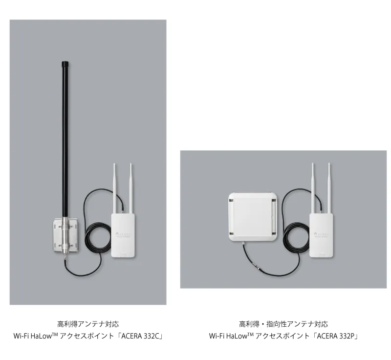 「ACERA 332C」は高利得アンテナに対応しており、従来の920MHz帯ダイポールアンテナに代わり、コリニアアンテナが組み込まれています。一方「ACERA 332P」は、さらに指向性の高いパッチアンテナを搭載し、特定の方向に対して最大利得を6dB向上させる特性を持っています。このおかげで、通信エリアは約1.3~1.5kmの範囲をカバーし、より広域でのデータ伝送が可能になります。